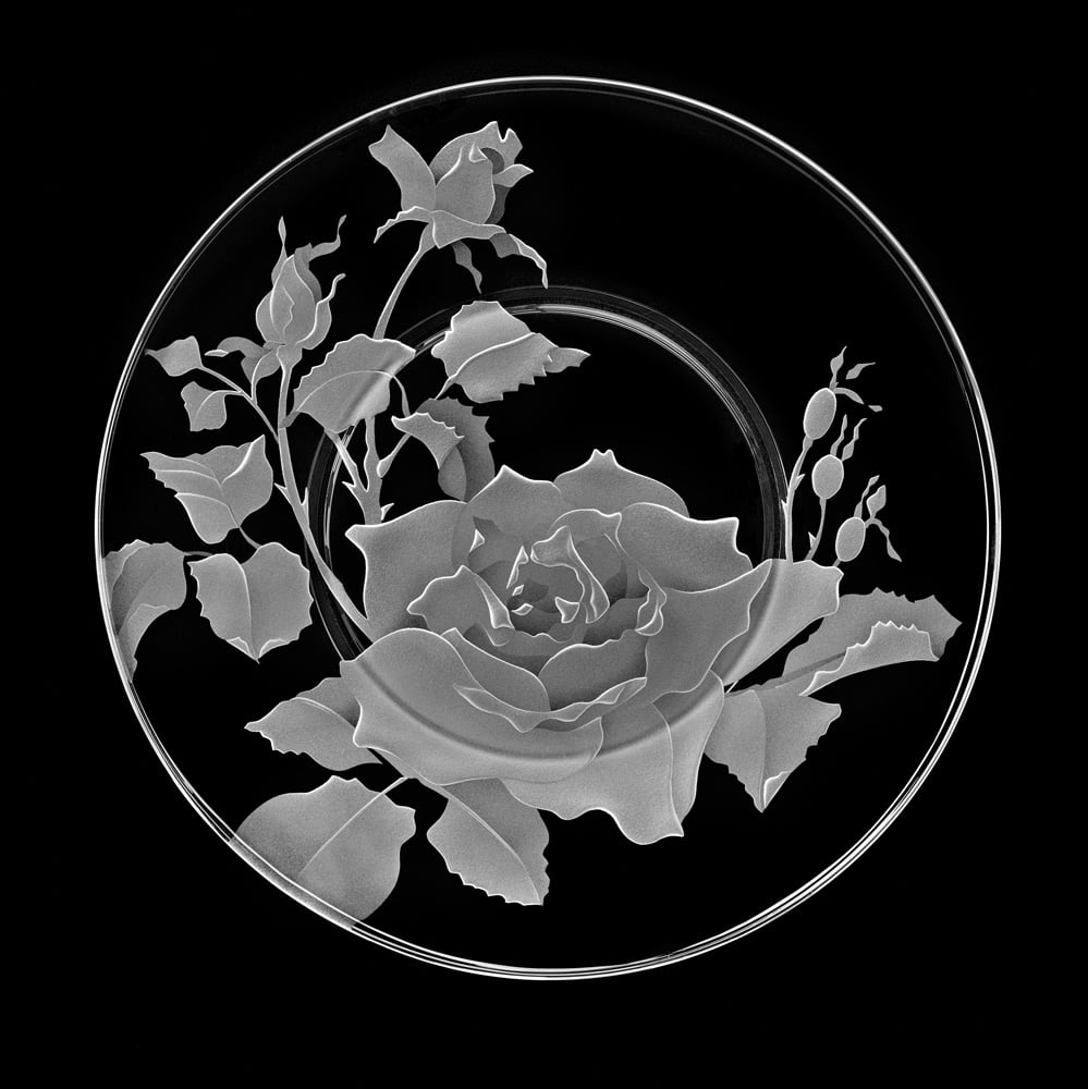$150.00. Our Plate selection is custom design driven. These pictures represent pieces that have been made in the past. If you are interested in this design, I would have to see what I can find in a clear glass plate. The price may have to be adjusted depending on the cost of the plate. Please call me at 816.721.4432 to discuss making you a custom Rose Salad/Dessert Plates.